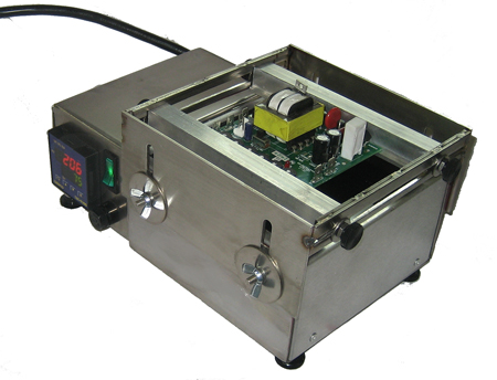 | Need to preheat circuit boards? Wenesco's PowerMax preheaters are designed to retrofit existing wave solder systems, replace or augment existing preheaters, and as a self-contained,stand-alone unit on your work bench. POWER MAX preheaters utilize powerful radiant heating elements which transfer heat to a target, one inch above the preheater surface, at a rate of 3 deg C/sec All preheaters include an accurate digital thermostat that displays current temperature and set point The temperature range is 25C to 300C. An illuminated on- off switch, fuse, and a 5-ft line cord are standard. |
